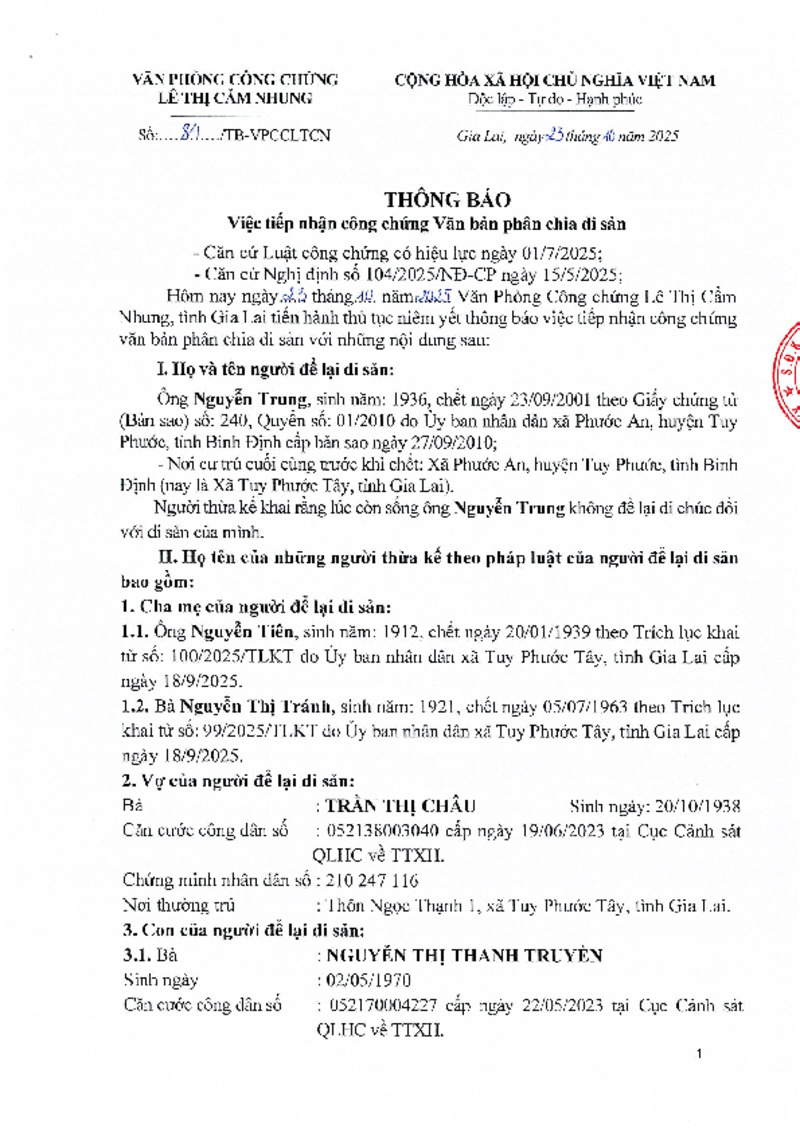 | Tiêu đề văn bản | Thông báo niêm yết công khai thông báo về việc tiếp nhận công chứng văn bản phân chia di sản của Văn phòng công chứng Lê Thị Cẩm Nhung | ||