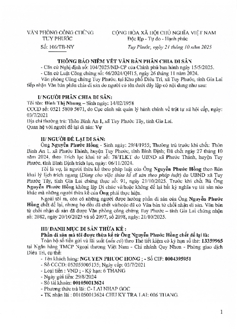 | Tiêu đề văn bản | Thông báo niêm yết công khai thông báo về việc tiếp nhận công chứng văn bản phân chia di sản của Văn phòng công chứng Tuy Phước | ||