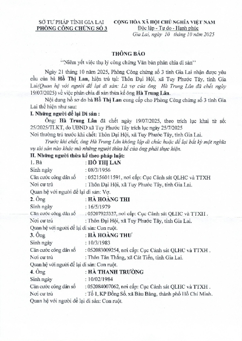 | Tiêu đề văn bản | Thông báo niêm yết công khai thông báo việc thụ lý công chứng Văn bản phân chia di sản của Phòng Công chứng số 3 | ||