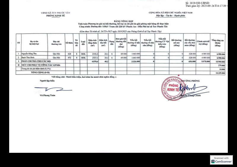 Tiêu đề văn bản | Về việc phê duyệt phương án giá trị bồi thường, hỗ trợ và chi phí do GPMB để thực hiện Công trình: Đường dây 110kV Trạm cắt 220 kV Phước An – Đồn Phó tại xã Tuy Phước Tây | ||