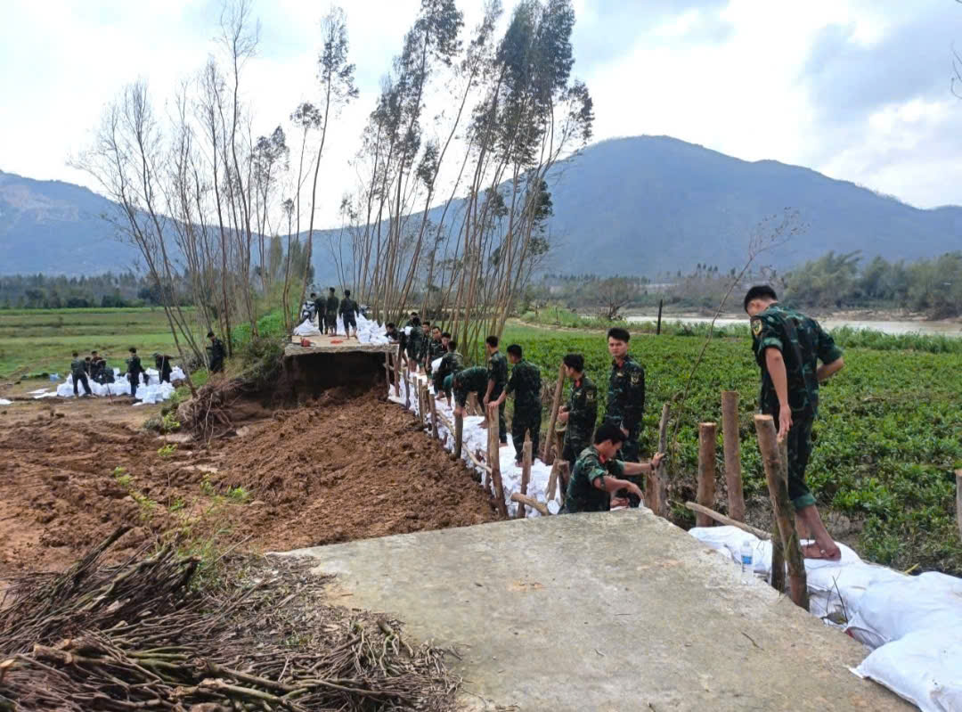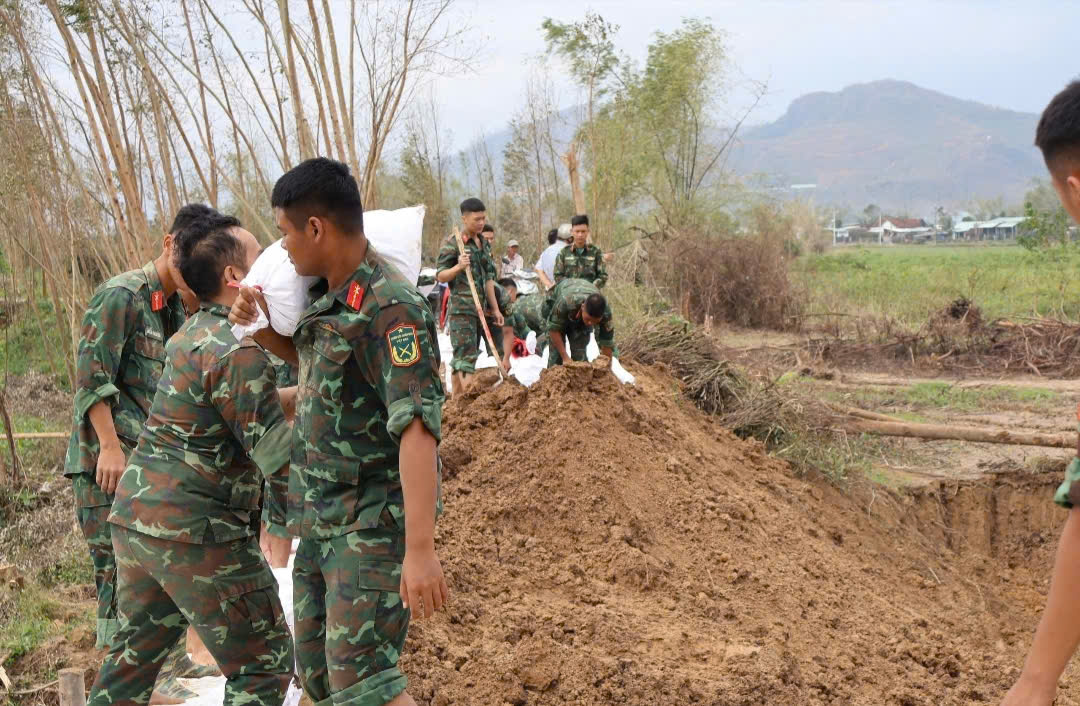 Ảnh: hình ảnh các chiến sĩ gia cố tại đoạn đê