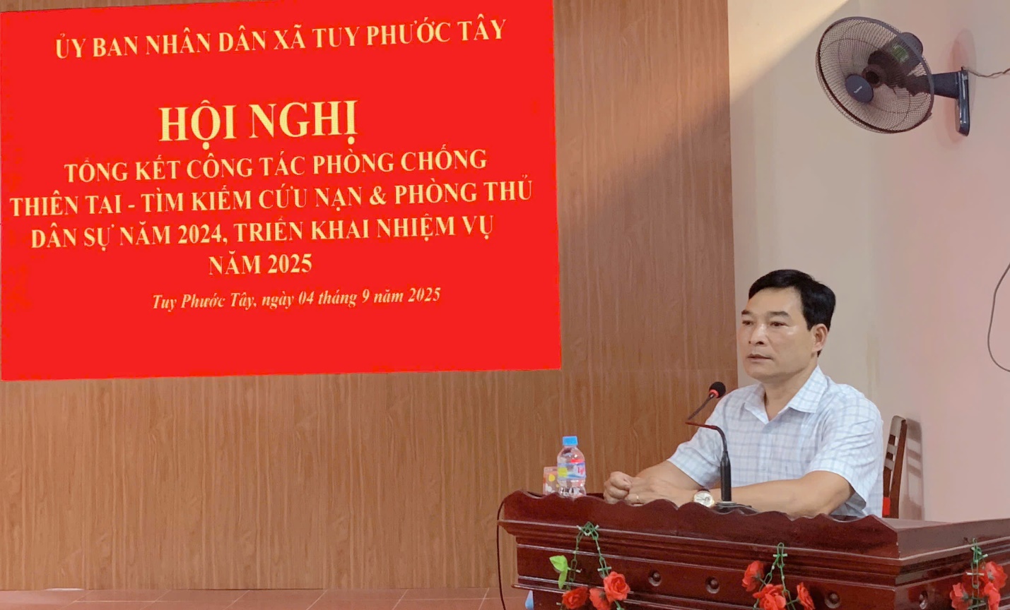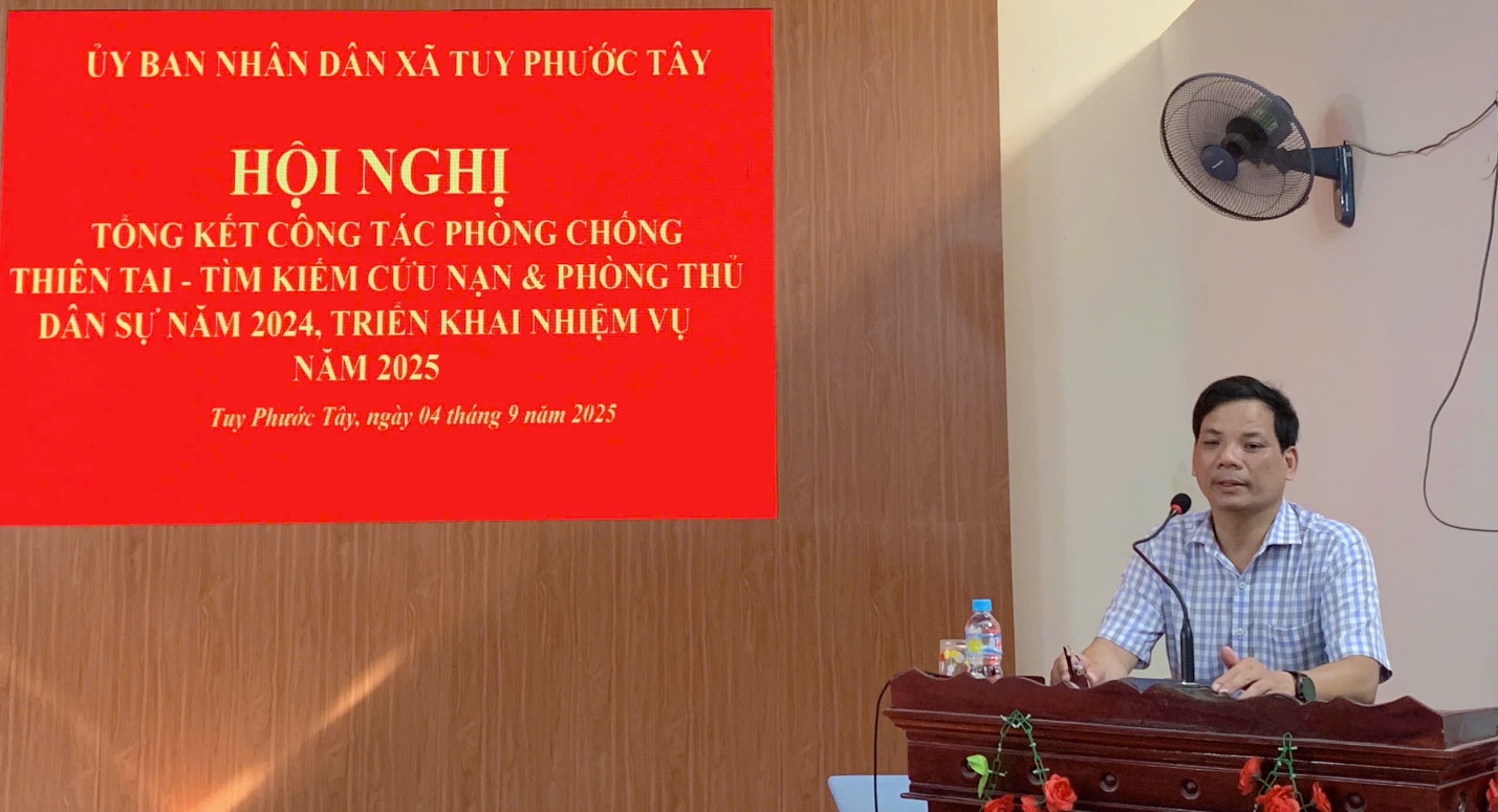 Chiều 4/9/2025, UBND xã Tuy Phước Tây tổ chức Hội nghị tổng kết công tác phòng, chống thiên tai, tìm kiếm cứu nạn và phòng thủ dân sự (PCTT, TKCN & PTDS) năm 2024; triển khai nhiệm vụ năm 2025. Dự hội nghị có đồng chí Phạm Công Đoan – Bí thư Đảng ủy, Chủ tịch HĐND xã; đồng chí Nguyễn Viết Thảo – Phó Chủ tịch UBND xã; lãnh đạo các phòng, ban chuyên môn cùng thành viên Ban Chỉ huy PCTT, TKCN & PTDS xã.