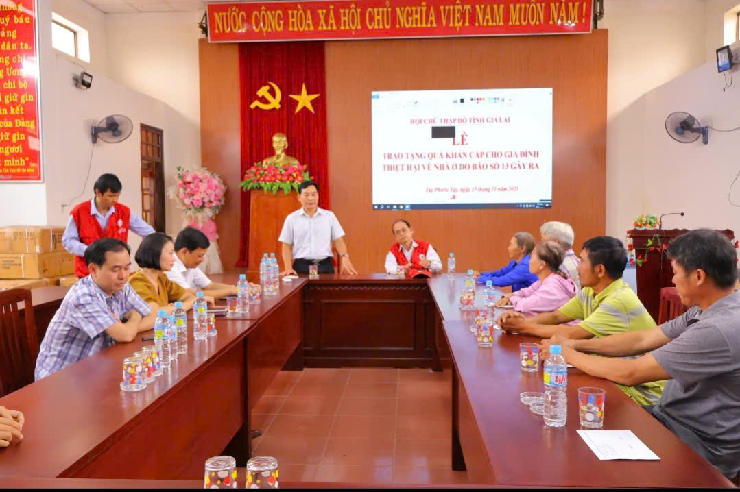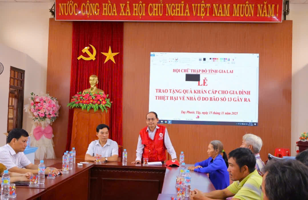 Tại đây, Hội Chữ thập đỏ Tỉnh và UBND xã Tuy Phước Tây đã trao quà hỗ trợ khẩn cấp cho 6 hộ gia đình có nhà bị sập hoàn toàn do ảnh hưởng của bão số 13 – Kalmaegi. Mức hỗ trợ mỗi hộ 10.000.000 đồng, nhằm kịp thời giúp các hộ ổn định trước mắt, giảm bớt khó khăn, từng bước khôi phục cuộc sống sau thiên tai.