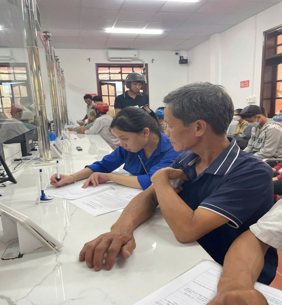 Ảnh: Người dân được đoàn viên thanh niên hỗ trợ thực hiện TTHC tại Trung tâm PVHCC xã.