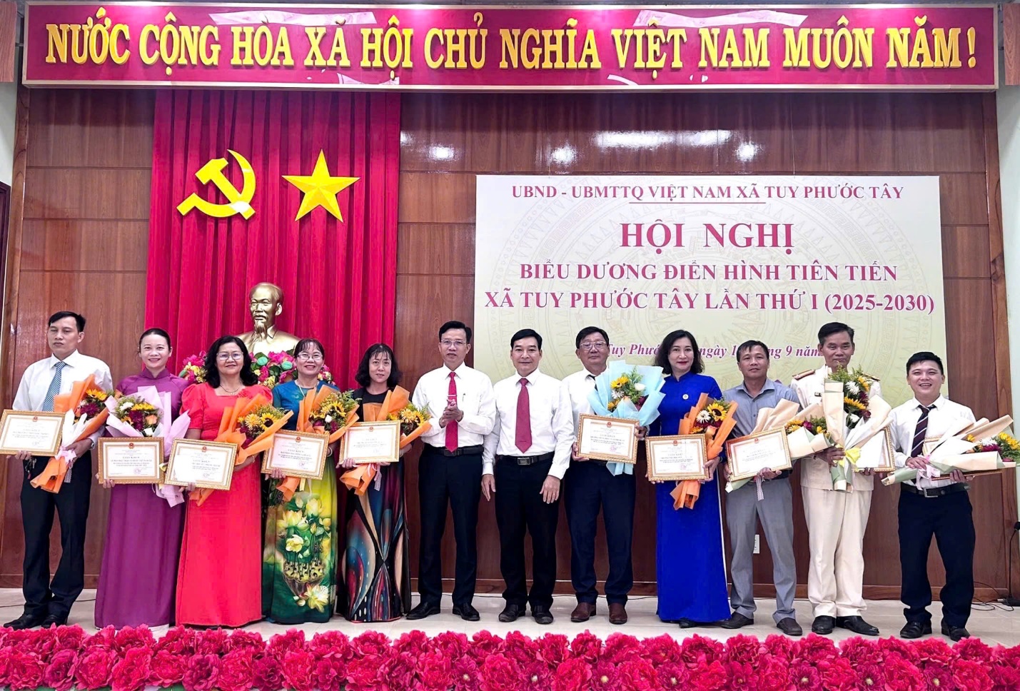 Sáng ngày 13/9, UBND xã Tuy Phước Tây long trọng tổ chức Hội nghị biểu dương điển hình tiên tiến lần thứ I, giai đoạn 2025 – 2030. Hội nghị có sự tham dự của đồng chí Phạm Công Đoan - Bí thư Đảng ủy, Chủ tịch HĐND xã; đồng chí Trần Duy Vũ - Phó Bí thư TT Đảng ủy; đồng chí Tô Minh Chánh -Phó Bí thư Đảng ủy, Chủ tịch UBND xã; cùng các đồng chí Ủy viên Ban Thường vụ Đảng ủy, Thường trực HĐND, lãnh đạo UBND, UBMTTQ Việt Nam xã; trưởng các đoàn thể cấp xã; các đơn vị trực thuộc xã và các đại biểu là những tấm gương điển hình tiên tiến được biểu dương.